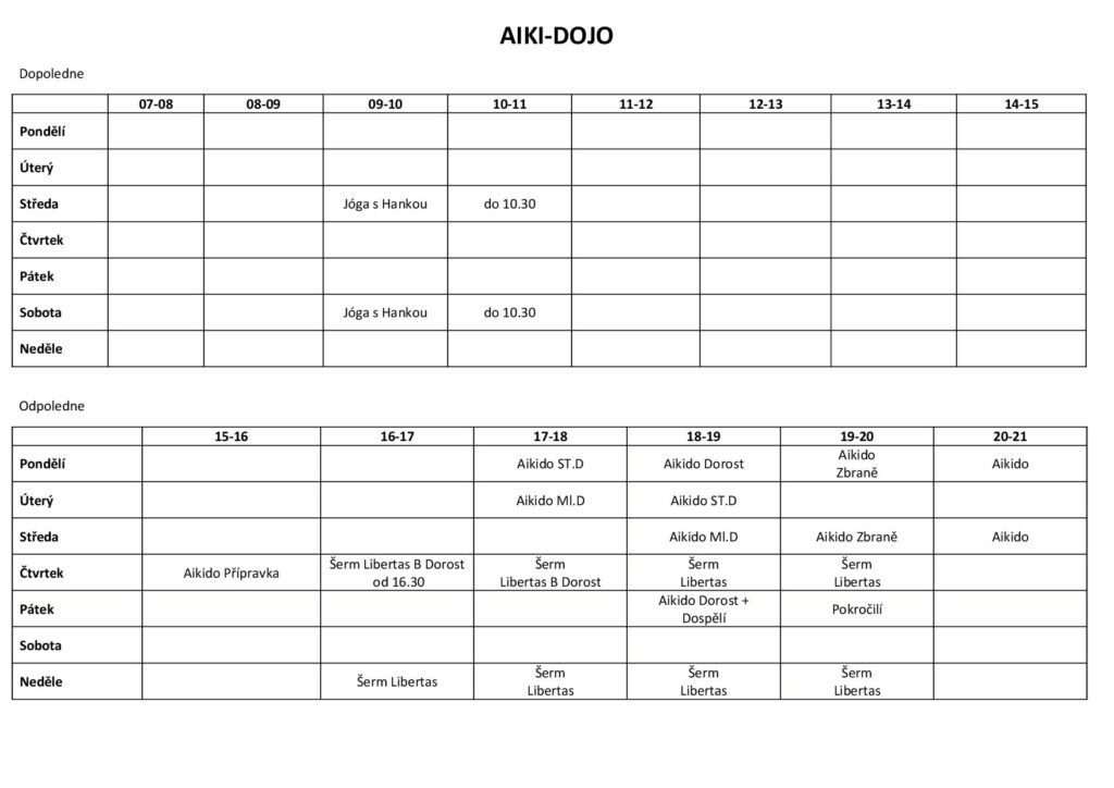 AIKI-DOJO rozvrhV době kdy je v rozvrhu volno mohou, probíhat individuální cvičení pro veřejnost. Pokud máte zájem o volné hodiny, kontaktujte předsedu spolku.