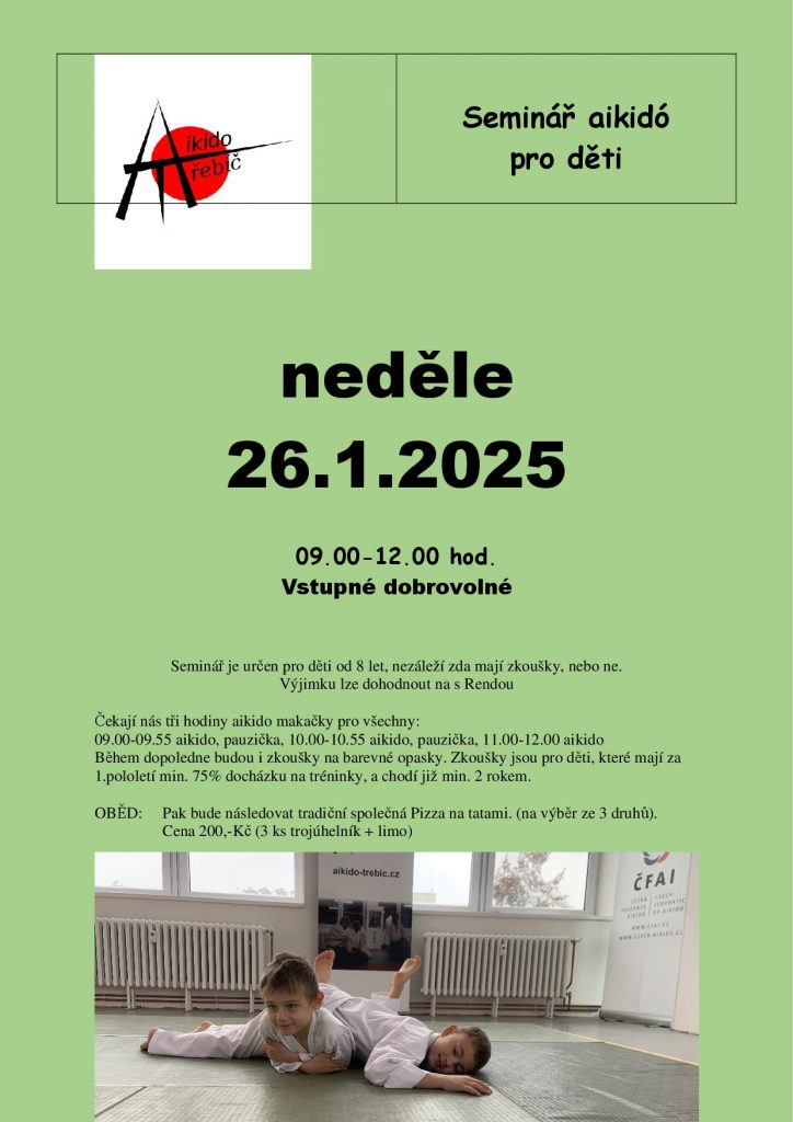 Pozvánka na seminář aikido pro děti od 9 let. V sobotu 6.12.2025 od 09.00 do 12.00hod. Tři hodiny cvičení aikido...